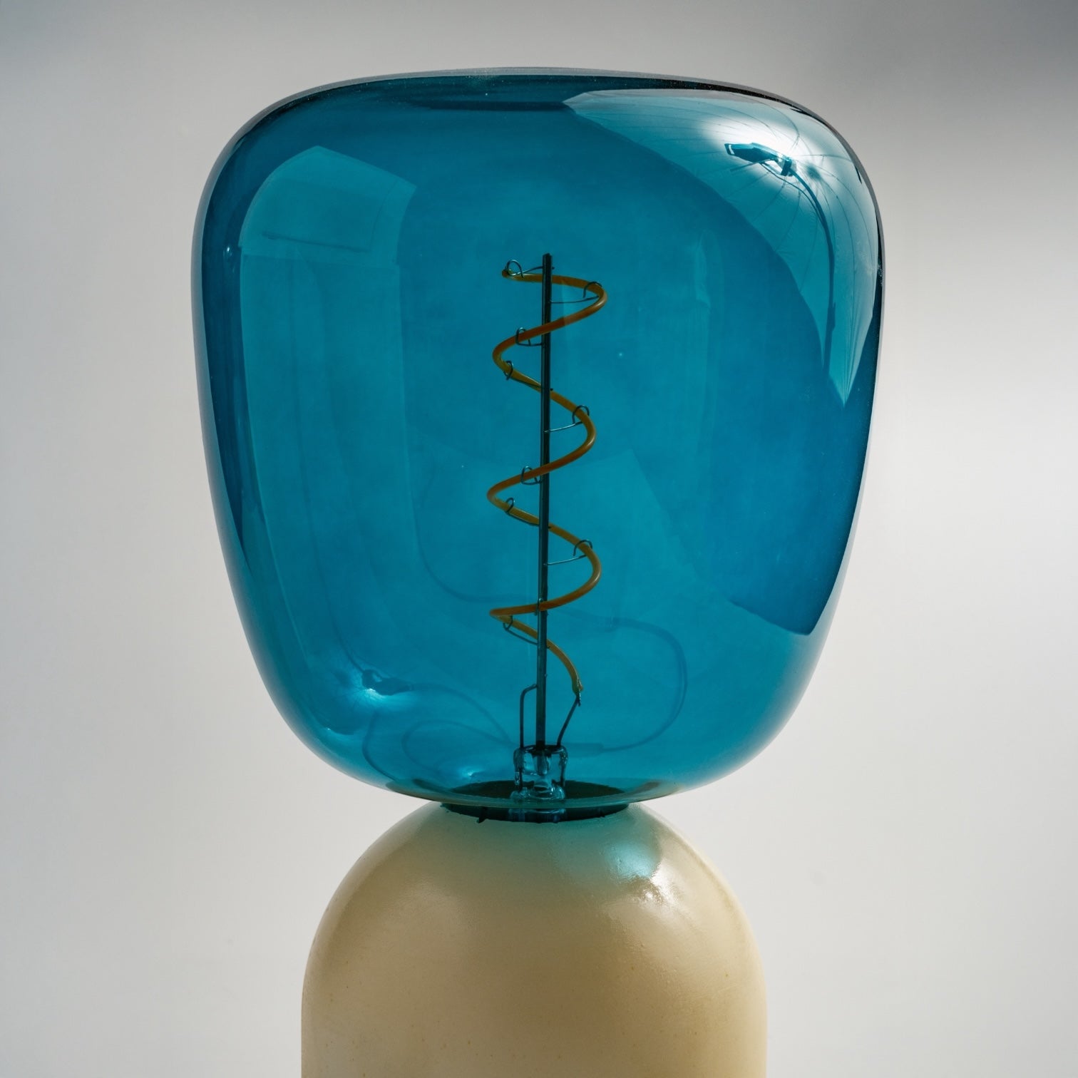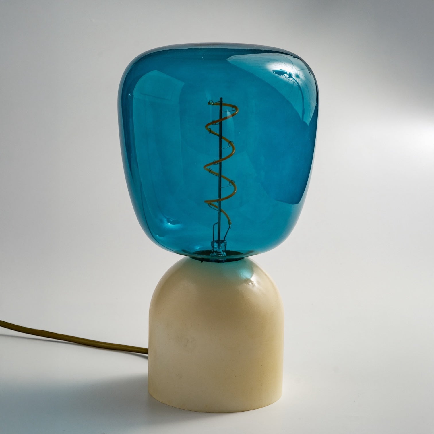 El yapımı beton kaide ve özel renkte seçilmiş cam şapka ile tasarlanmış masa lambası