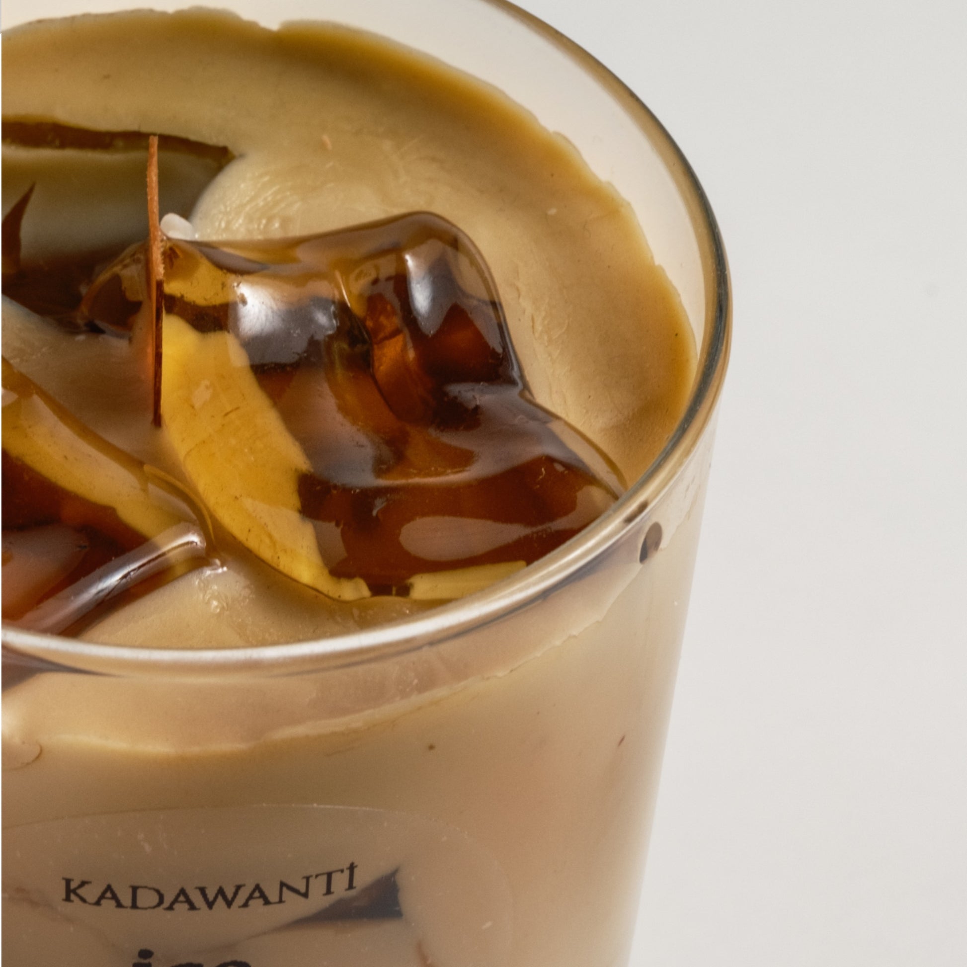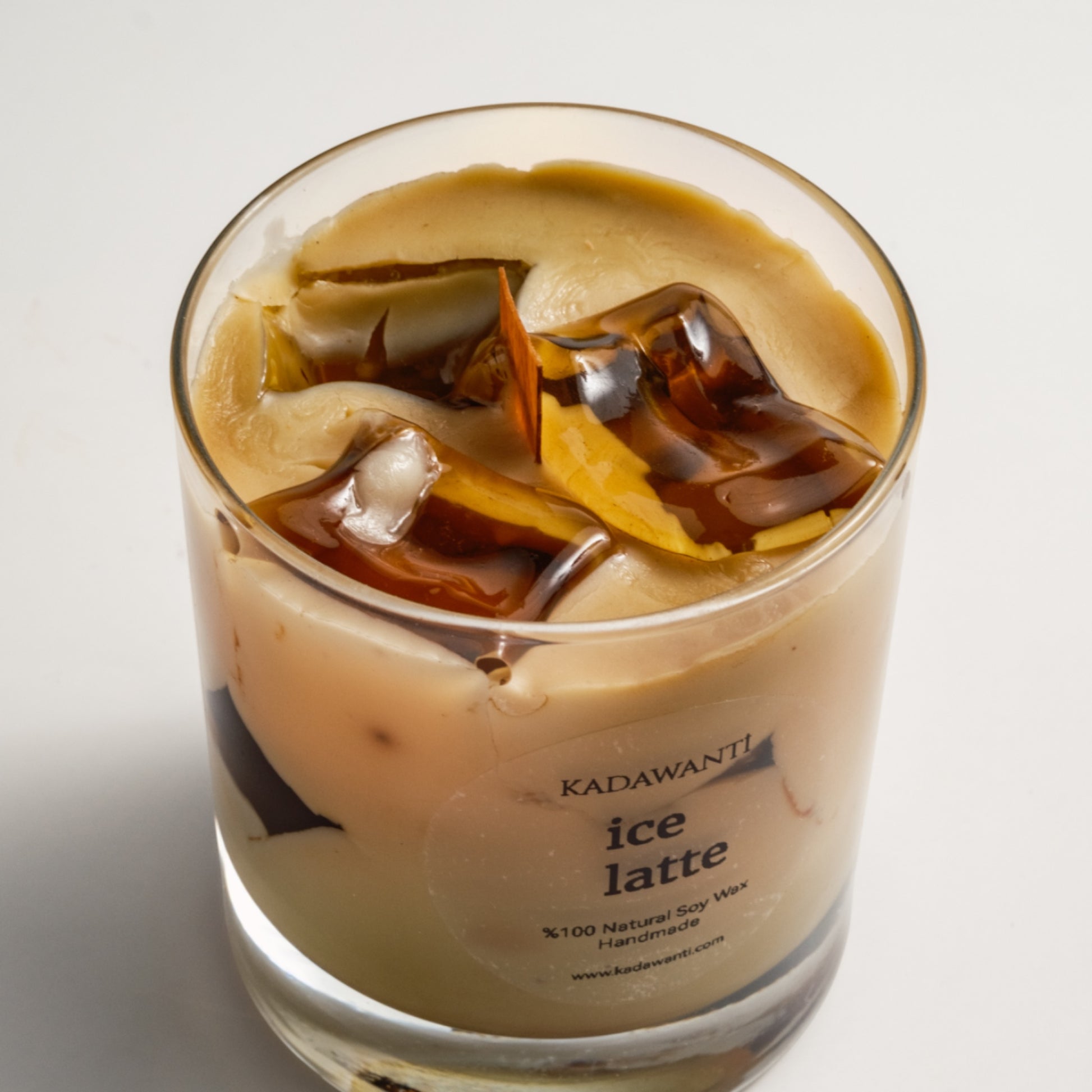 320 cc hacminde şeffaf cam kavanoz içerisinde, ice latte görünümü verilmiş el yapımı mum
